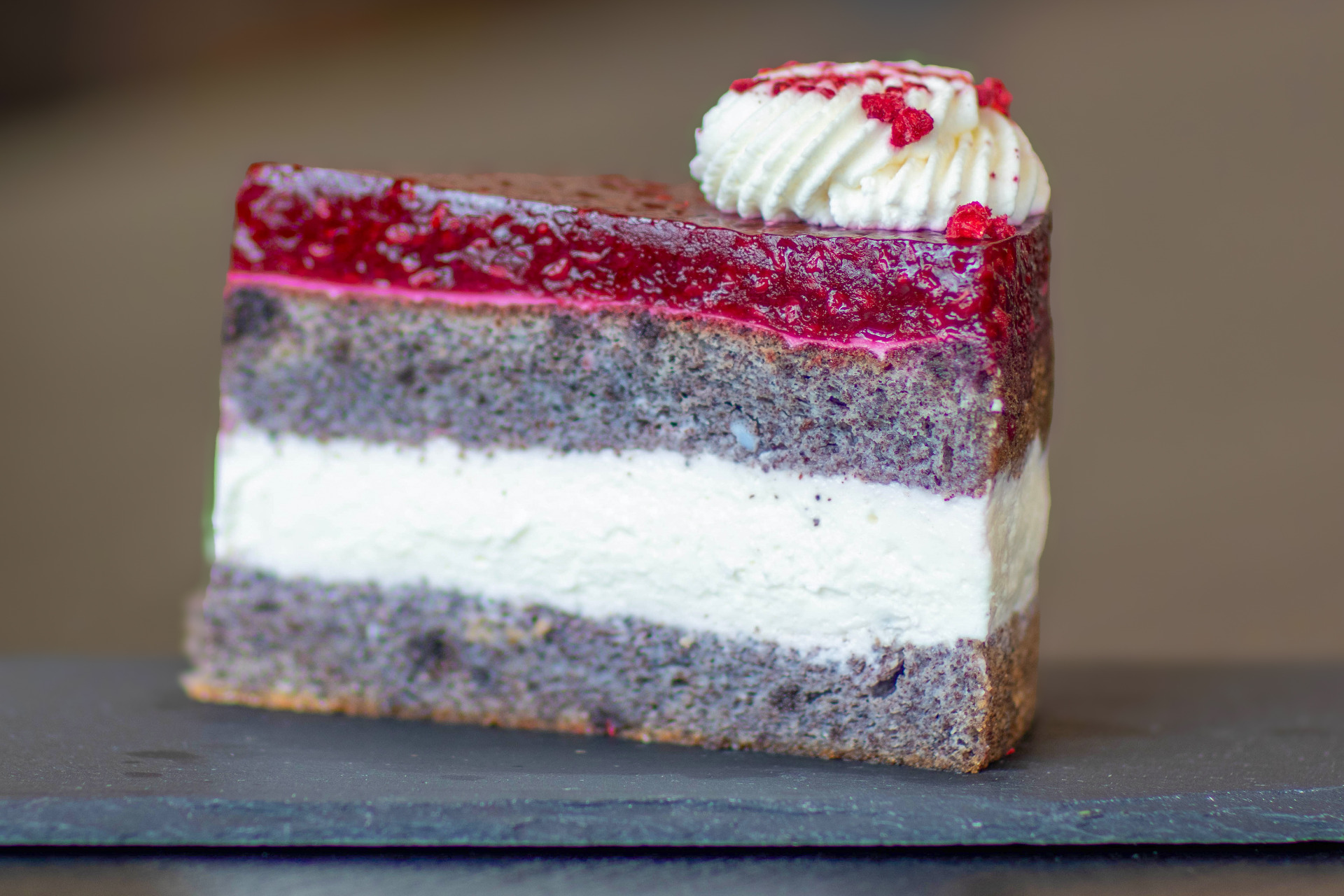 Makovo - malinový dort zaujme jemným korpusem s mákem a malinami, který doplňuje lehký smetanový krém a svěží malinový přeliv. Vyvážená chu´t, která potěší na první sousto.